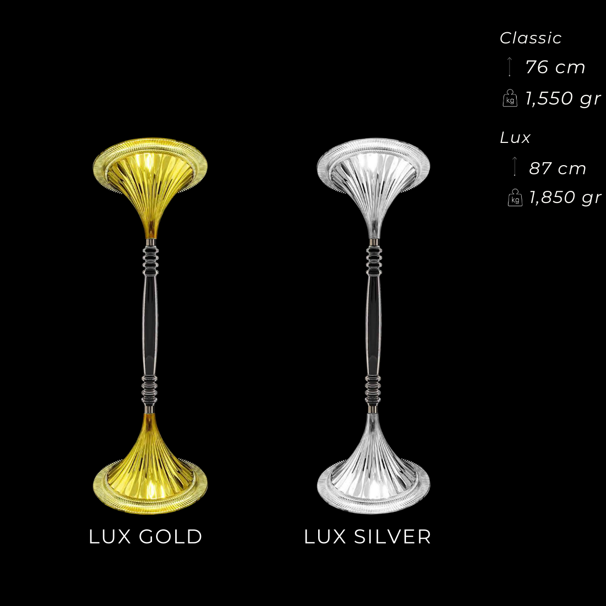 76 cm yüksekliğinde kristal model vazo olup gold ve gümüş renk seçenekleriyle organizasyon dekorlarında kullanılır.